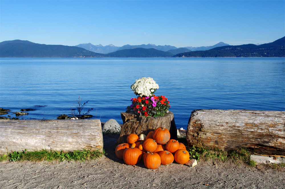 What could be a more “marvellous treat” than walking along Spanish Banks on a perfect October morning in Vancouver and being greeted by a pile of perfect pumpkins set against the beauty of Howe Sound looking towards Lighthouse Park, Bowen Island and the distant mountains that in a week or two will be covered in snow.
