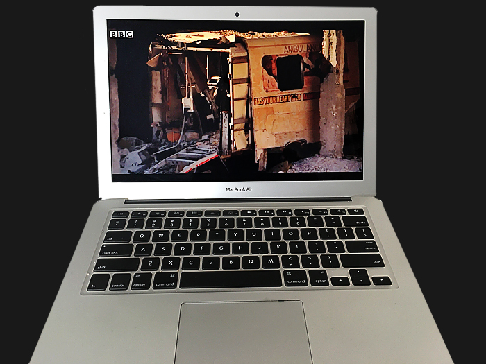 Watching on my laptop one of Jeremy Bowen’s reports from Syria, one image stood out as a metaphor for all the White Helmet volunteer relief workers, first responders and medics who have lost their lives in the name of peace and humanity trying to save these children and families. This ambulance had been pulverized in targeted bombing and on its side are the words HAS YOUR HEART DIED, and hidden behind the pillar I believe the words read ALONG WITH YOUR CHILDREN?