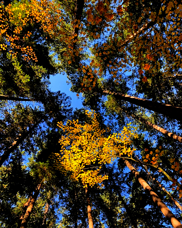 546 day XV – First leaf of the day, and looking up with number 303 against a blue, blue sky.